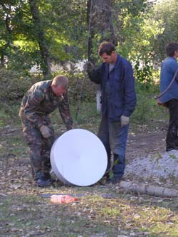 На нашей еще не готовой БС крепят последний третий антенный модуль и ориентируют его в нужном направлении.