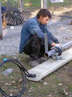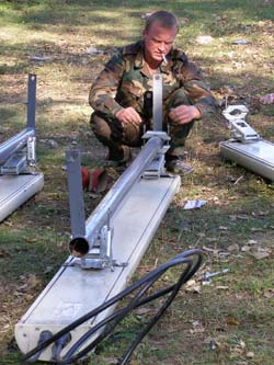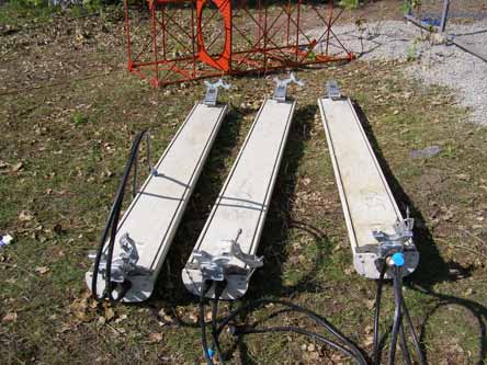 К антеннам прикрепляют крепеж на котором они будут висеть на верху вышки. В это время на вышке проходят подготовительные работы для подъема.