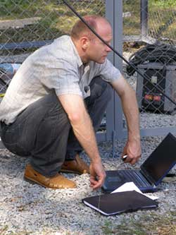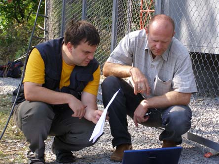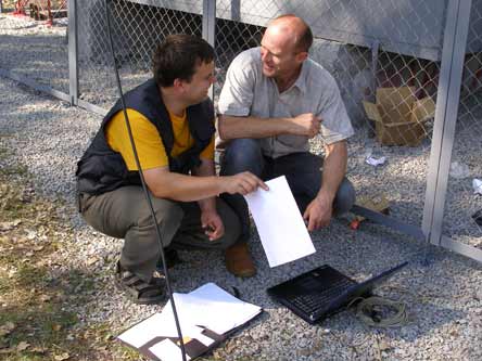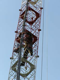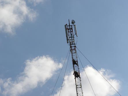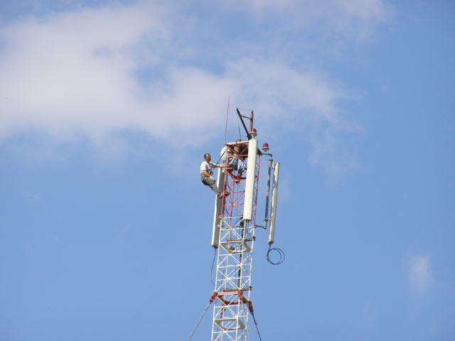 Монтажные работы по установке основного сетевого оборудования на вышке закончились креплением двух сигнальных фонарей. На следующий день к месту установки базовой станции прибыли представители оператора мобильной связи для настройки уже установленного оборудования. Альпинисты проводят осмотр и подключение оборудования для юстировки.