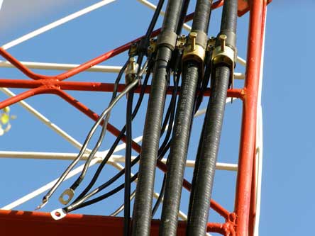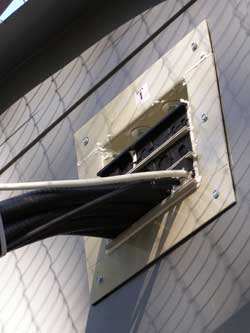 После крепления кабеля по всей длине вышки, он заводится в будку. В месте ввода кабеля в будку он обжимается пластиковыми втулками, щели между втулками и стенками будки обрабатываются монтажной пеной.